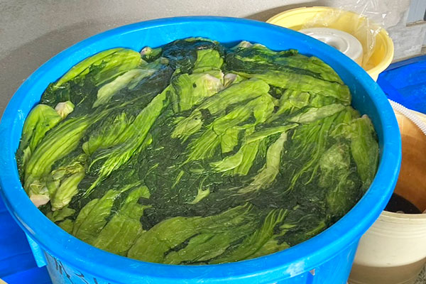 収穫した高菜を天日干しして、塩をふり、足でゆっくり踏みながら漬け込むのが特徴です。